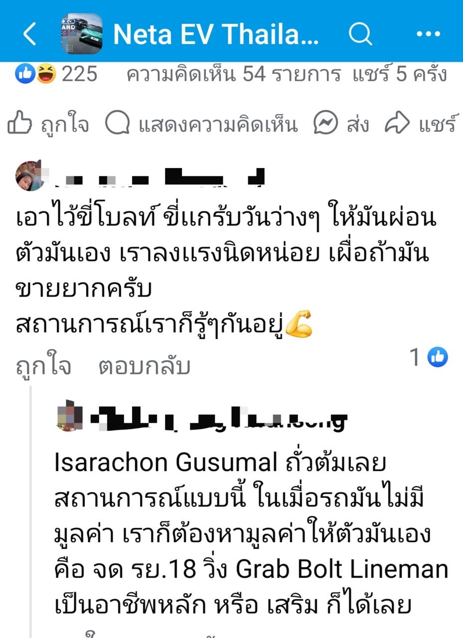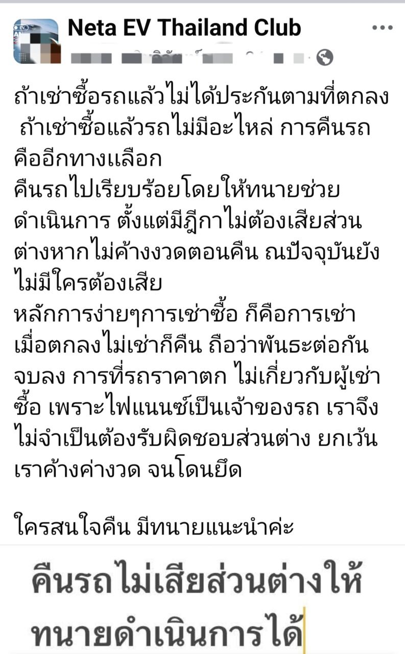 และข้อมูลจาก เฟสบุ๊ค Neta EV Thailand Club ทางเจ้าของรถเนต้าต่างวิตกกังวลหนัก กว่าช่วงก่อนหน้านี้ทั้งเรื่องของศูนย์บริการ อะไหล่ รวมไปถึงธุรกิจอื่นที่เกี่ยวข้องทั้งสถาบันการเงินและการรับประกันของบริษัทประกันภัย ทางเจ้าของรถเนต้าจำนวนหนึ่งต้องการที่จะคืนรถ เลิกผ่อนชำระกับบริษัทลิสซิ่ง หรือสถาบันการเงิน และยอมที่จะเสียเครดิต หรือติดแบล็คลิส เพราะมองว่ารถแบรนด์นี้ไม่มีอนาคต ถือครอง หรือใช้บริการ ก็ไม่มีประโยชน์ หรือมีบางรายประกาศยกรถให้ฟรี แล้วไปผ่อนต่อเอง