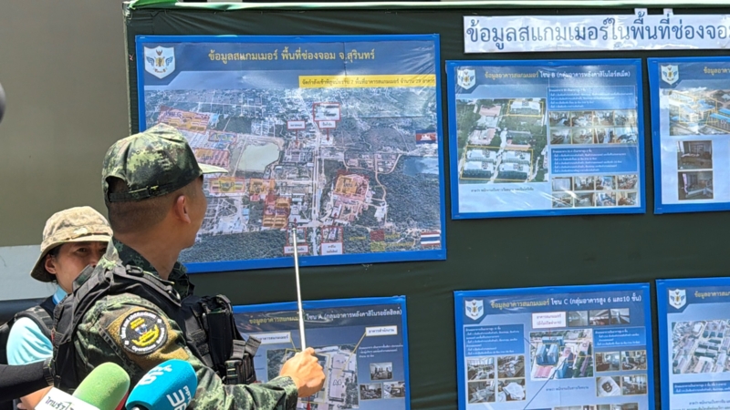 ศูนย์แถลงข่าวร่วมสถานการณ์ไทย-กัมพูชา ลงพื้นที่ตรวจสอบฐานสแกมเมอร์ บริเวณพื้นที่โอร์เสม็ด-ช่องจอม เพิ่มเติม พบพื้นที่หลอกคนนานาชาติ ห้องจำคุก เครื่องทรมาน เป็นหลักฐานชี้ชัดความเชื่อมโยงอาชญากรรมข้ามชาติ เป็นภัยคุกคามต่อประเทศไทย วันนี้ (7 เม.ย.2569) พล.อ.อ.ประภาส สอนใจดี ผู้อำนวยการศูนย์แถลงข่าวร่วมสถานการณ์ชายแดนไทย-กัมพูชา (JIC) ลงพื้นที่ติดตามสถานการณ์ชายแดนไทย-กัมพูชา และประเด็นศูนย์สแกมอาชญากรรมออนไลน์ข้ามชาติ ในพื้นที่ช่องจอม ต.ด่าน อ.กาบเชิง จ.สุรินทร์ ในพื้นที่ที่ทหารไทยเข้าควบคุม และวางรั้วลวดหนาม ตามถ้อยแถลงร่วม หรือ JS หลังเหตุปะทะชายแดนไทยกัมพูชาเมื่อปลายปีที่แล้ว