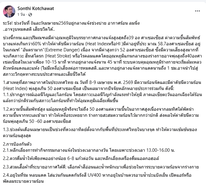 นักวิชาการ ด้านสิ่งแวดล้อม ไทยเตือน ไทยกำลังเข้าสู่ภาวระ "ซูเปอร์เอลนีโญ" ที่ส่งผลให้เกิดสภาวะร้อนจัด แห้งแล้งรุนแรง และฝนทิ้งช่วงยาวนานกว่าปกติ ซึ่งผลกระทบเห็นชัดคืออากาศที่ร้อนขึ้นทันที รองลงมาคือปัญหาภาคการเกษตรเมื่อวันที่ 8 เม.ย.2569 สนธิ คชวัฒน์ ผู้ทรงคุณวุฒิด้านสิ่งแวดล้อม และสุขภาพ ชมรมนักวิชาการสิ่งแวดล้อมไทย โพสต์ข้อความผ่าน Facebook Sonthi Kotchawat เตือนประเทศไทยจะมีอากาศร้อนจัด ช่วง 8-9 เม.ย.2569 โดยคาดการณ์ว่าอุณหภูมิในบรรยากาศกลางแจ้ง อาจสูงถึง 39 องศาเซลเซียส ค่าความชื้นสัมพัทธ์บางแห่งเกินกว่า 60% ทำให้ค่าดัชนีความร้อน (Heat Index หรือ HI) มีค่าอยู่ที่ประ มาณ 58.7 องศาเซลเซียส ซึ่งอยู่ในเกณฑ์ "อันตรายมาก" เนื่องจากมีค่าสูงกว่า 52 องศาเซลเซียส ซึ่งมีความเสี่ยงสูงมากที่จะเกิดภาวะ ฮีทสโตรก (Heat Stroke) หรือโรคลมแดด