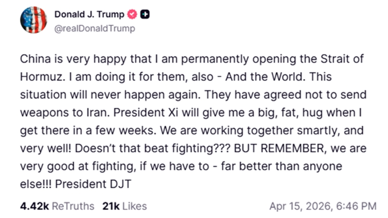 ประธานาธิบดีสหรัฐฯ ระบุ จีนเห็นด้วยกับการเปิดช่องแคบฮอร์มุซ และตกลงไม่ส่งอาวุธให้อิหร่าน พร้อมแสดงความเชื่อมั่นในความสัมพันธ์กับผู้นำจีน ก่อนการเยือนปักกิ่งในเร็วๆ นี้วันนี้ (15 เม.ย.2569) ประธานาธิบดี โดนัลด์ ทรัมป์ โพสต์ผ่านทรูธโซเชียล ถึงความคืบหน้าล่าสุดในสถานการณ์ความตึงเครียดบริเวณช่องแคบฮอร์มุซ โดยระบุว่ารัฐบาลปักกิ่งแสดงความพึงพอใจเป็นอย่างมากที่สหรัฐฯ กำลังดำเนินการเปิดเส้นทางการเดินเรือในช่องแคบฮอร์มุซให้กลับมาใช้งานได้ตามปกติ "อย่างถาวร"